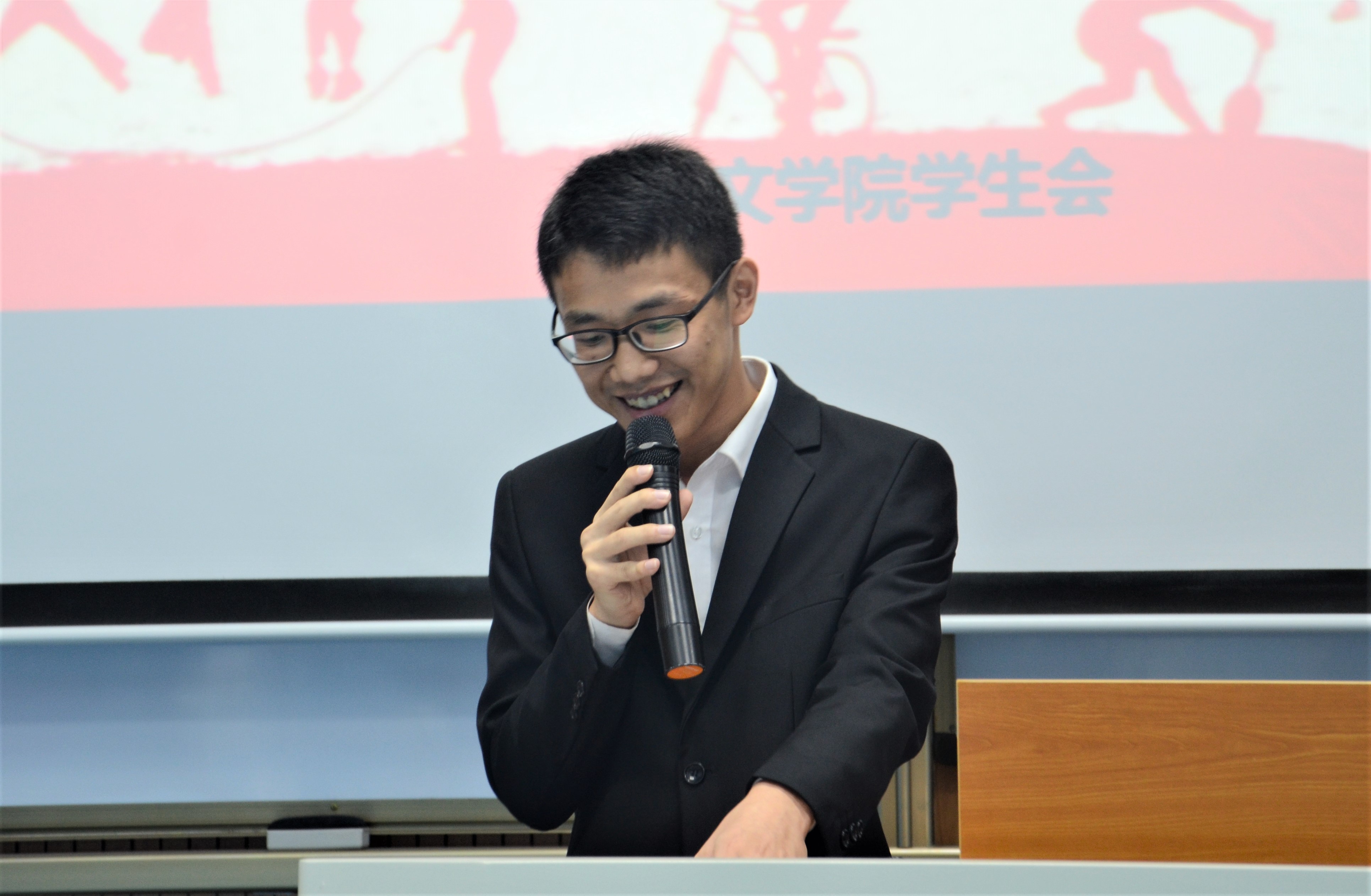 第十一届学生会主席吴志伟发言,回顾了自己当时加入学生会的初心,总结了本届学生会干部在本次校运会等学院工作中的辛苦付出,希望新一届干部接好这一棒,心中有人文情怀,脚踏实地工作。