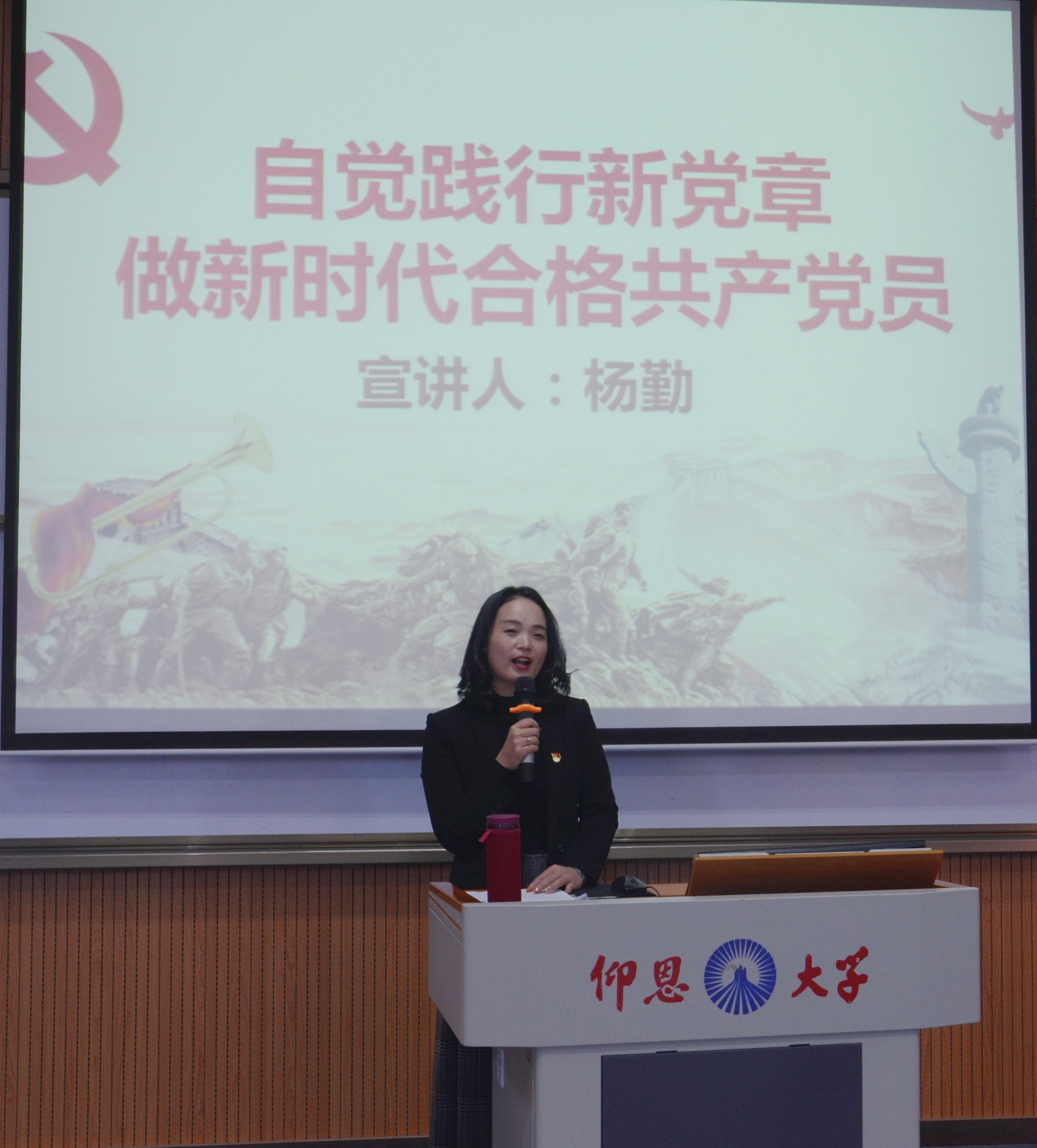2018年11月29日下午,思政部和betway西汉姆联官网在博雅讲堂联合举办“新思想”大宣讲活动,法学院党总支书记杨勤作“自觉践行新党章,做新时代合格共产党员”主题宣讲,思政部主任李克钦主持,思政部教师、betway西汉姆联官网学生党员、积极分子参加本次活动。