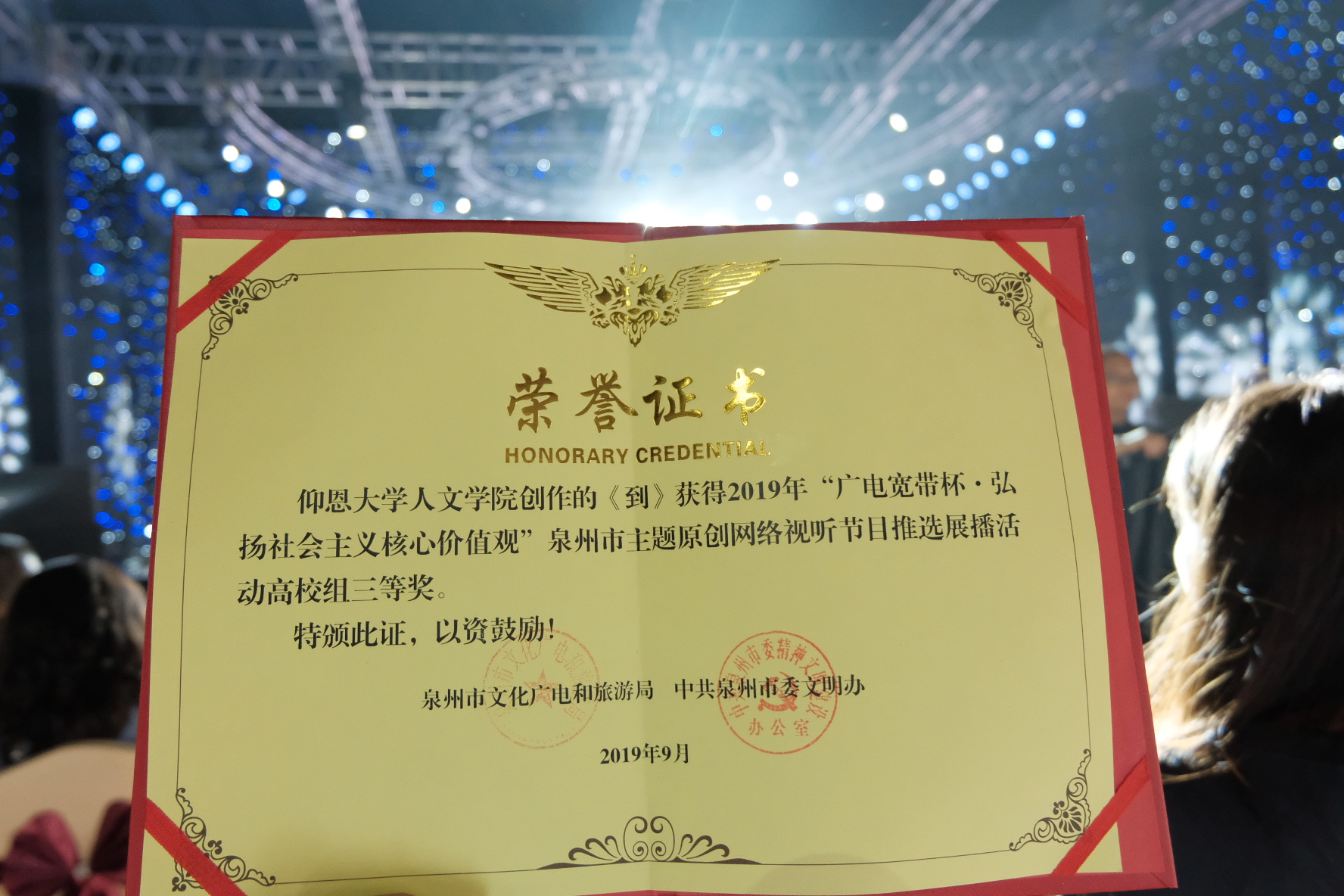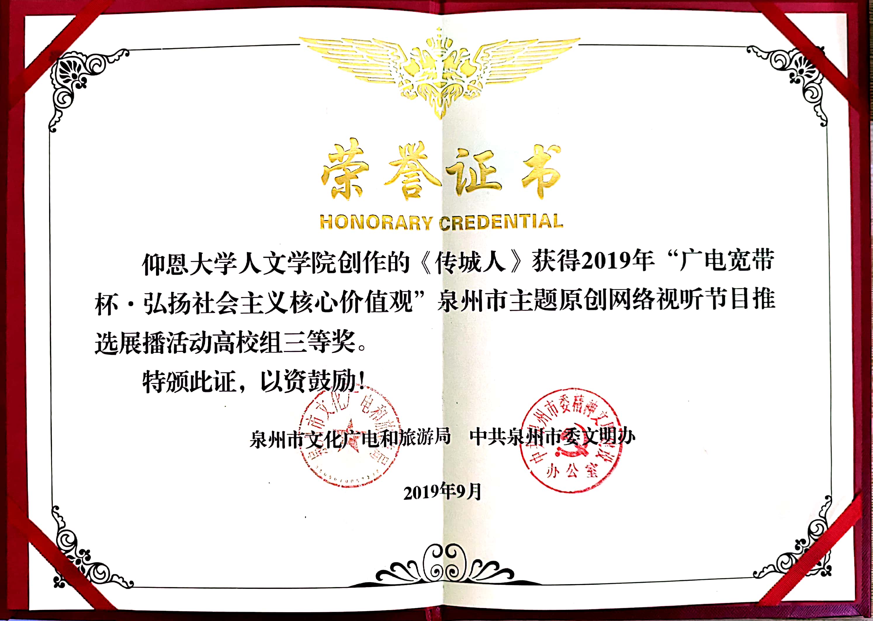 12月26日下午,betway西汉姆联官网和电视台选送的原创作品《到》《传城人》在2019年“广电宽带杯·弘扬社会主义核心价值观”泉州市主题原创网络视听节目推选展播活动中荣获高校组三等奖。