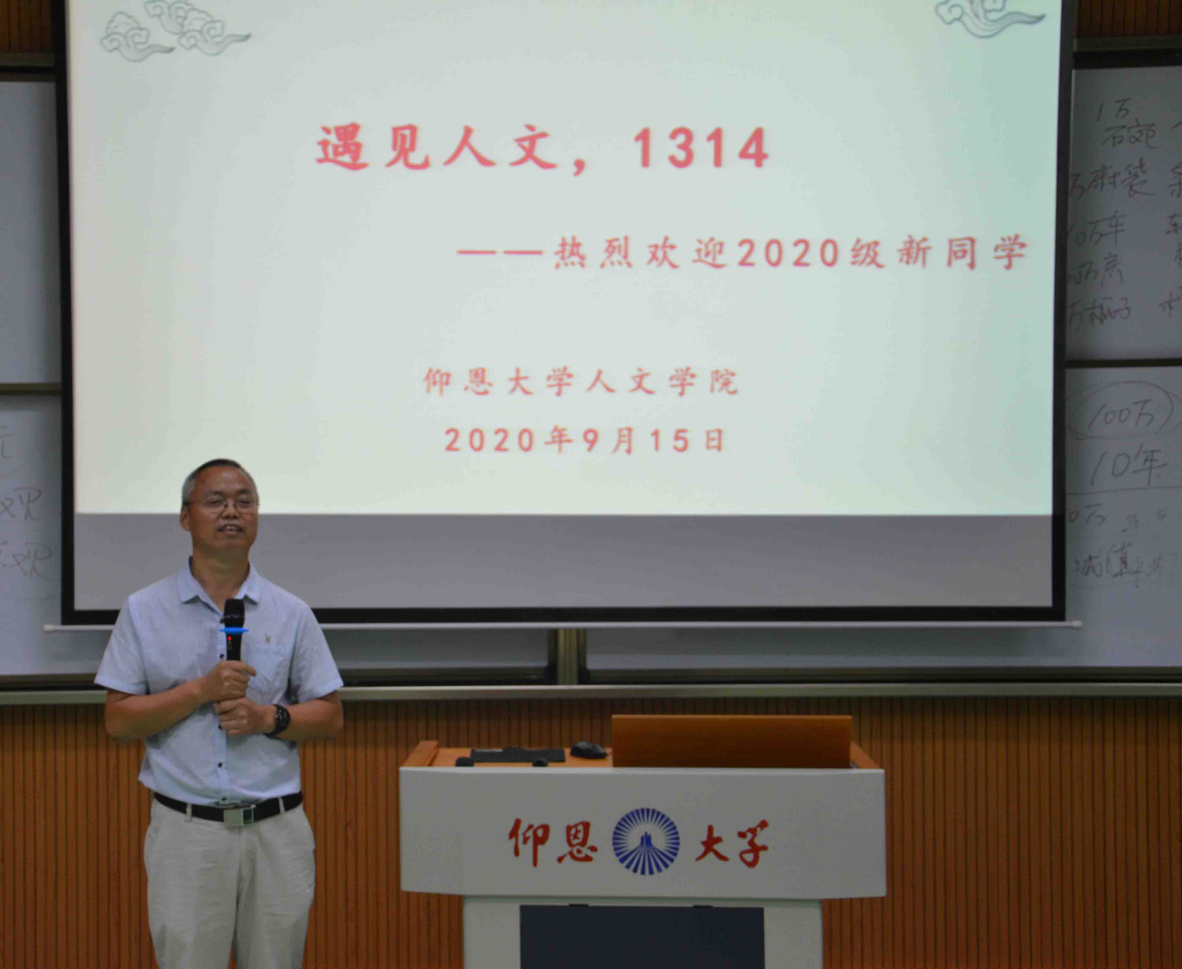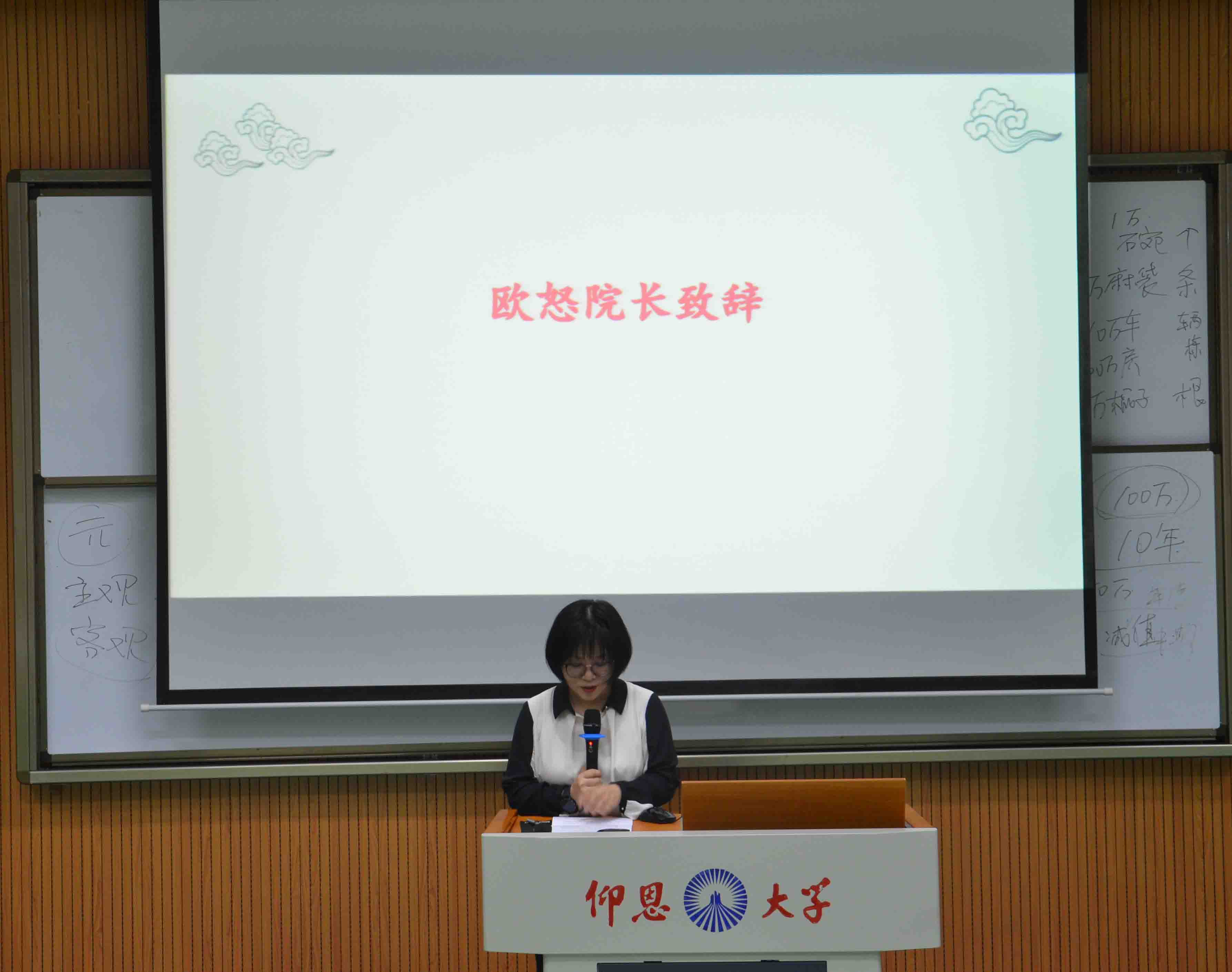 胡友仁书记主持 “来到仰恩大学,首先要念一本书——《仰恩之子》,记住一个名字——吴庆星,这是我们校主的名字,熟读并背诵一句话:学会做人,守信笃行;学会做事,创业有成,然后用四年甚至一生的时间去领悟、践行和发扬一种精神——仰恩精神。”欧怒院长对新同学提出四点希望:一是热爱祖国,志存高远。二是脚踏实地,锐意进取。三是思想健康,积极乐观。四是热爱劳动,节约粮食。受新冠肺炎疫情的影响,2020年是特殊的一年。欧院长希望新同学心存感恩之心,珍惜当下,加倍努力学习,回馈那些为我们负重前行的英雄和人民。