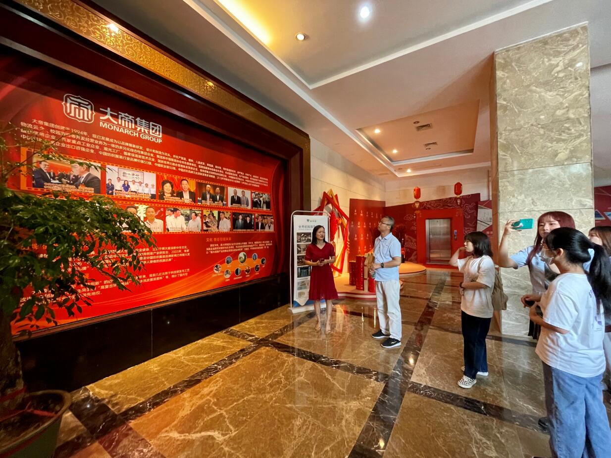 在大帝集团品牌文化馆,人力资源部李召娣详细介绍了大帝集团的发展历程、品牌战略、品牌文化和品牌愿景。大帝集团是一家以服装品牌运营为主,多元化综合性大型集团企业。恪守“用时尚传承经典,让品牌荣耀人生”的企业愿景,生产的人造革、PU涂层革(干湿法)、复合及功能型等服装面料在市场上处于领先地位,已荣获“中国服装双百强企业”、“中国纺织服装企业竞争力500强”“中国纺织服装企业出口100强”、“中国驰名商标”等荣誉称号,目前拥有上千家品牌专卖店(专柜、专厅),销售网络遍布海内外。集团注重研发投入、推进产业创新发展等方面给师生留下了深刻印象。