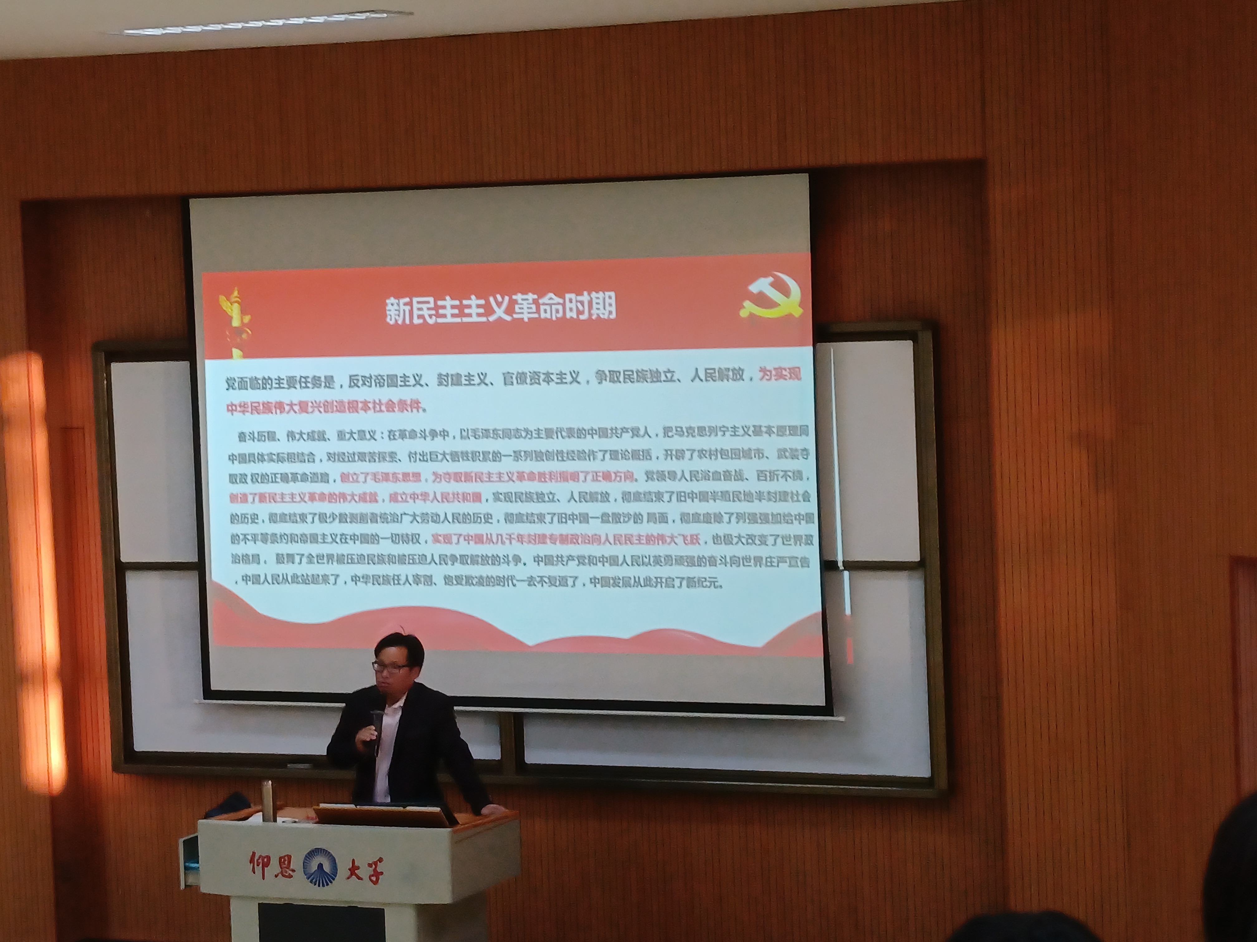 袁国华老师 会上,袁国华利用丰富的历史资料、详实的图片展示等方式,围绕“六中全会的议程、重大成就和重大意义”、“《历史决议》的主要内容和重大创新”、“深刻领悟六中全会精神”三大方面,全面阐释了党的十九届六中全会的精神实质和丰富内涵。此外,袁国华还从夺取新民主主义革命伟大胜利、完成社会主义革命和推进社会主义建设、进行改革开放和社会主义现代化建设、开创中国特色社会主义新时代四个部分全面回顾了中国共产党百年奋斗的历史进程与重大成就,高度总结了中国共产党百年奋斗的历史意义与历史经验,对新时代中国共产党以史为鉴、开创未来应坚持的根本原则进行了系统讲解。