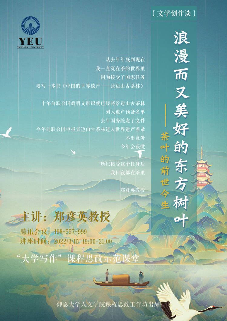 讲座海报 本次线上讲座,郑彦英教授通过独特的教学方式并结合自己在创作作品过程中的所见所闻,结合茶文件教育,加深了同学们对文学创作的理解,同时巧妙融入茶文化中的思想价值理念,进而推动betway西汉姆联官网思政示范课程的新发展。(欧璟香、林凯燕/文图)