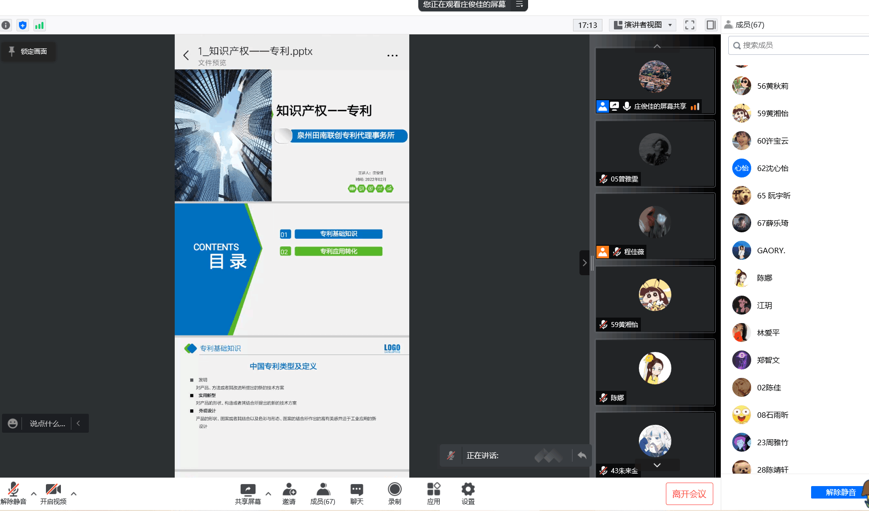 线上知识产权专利课程 首先,庄俊佳老师围绕着“专利基础知识”和“专利应用转化”这两个主题展开授课。开篇,庄俊佳老师通过介绍“中国专利类型的定义、说明”以及“中国普通专利的申请流程”,引出了专利的三个特性“新颖性”、“创造性”、“实用性”。同时,庄俊佳老师通过提问互动的方式来引导同学们深入思考。