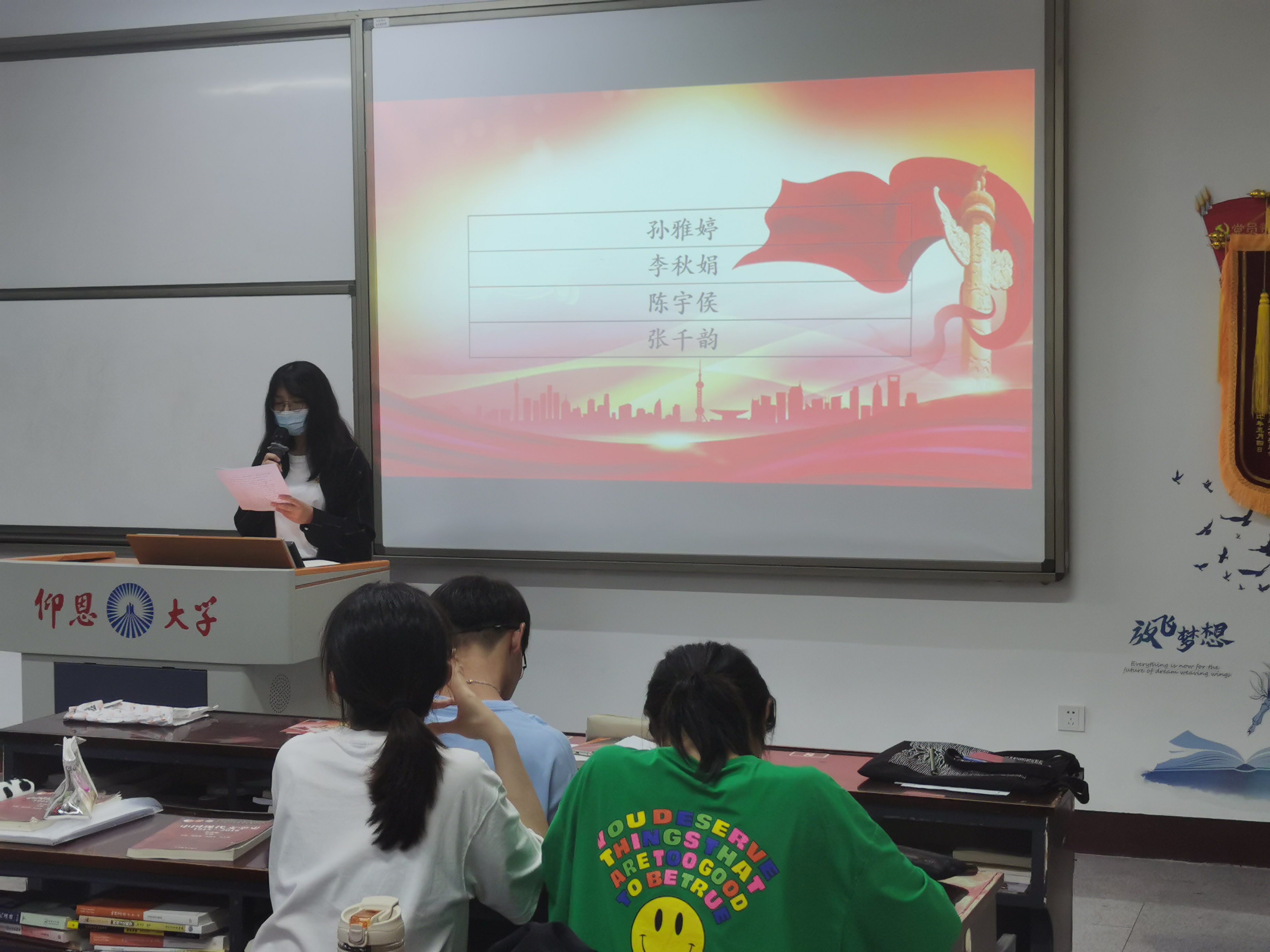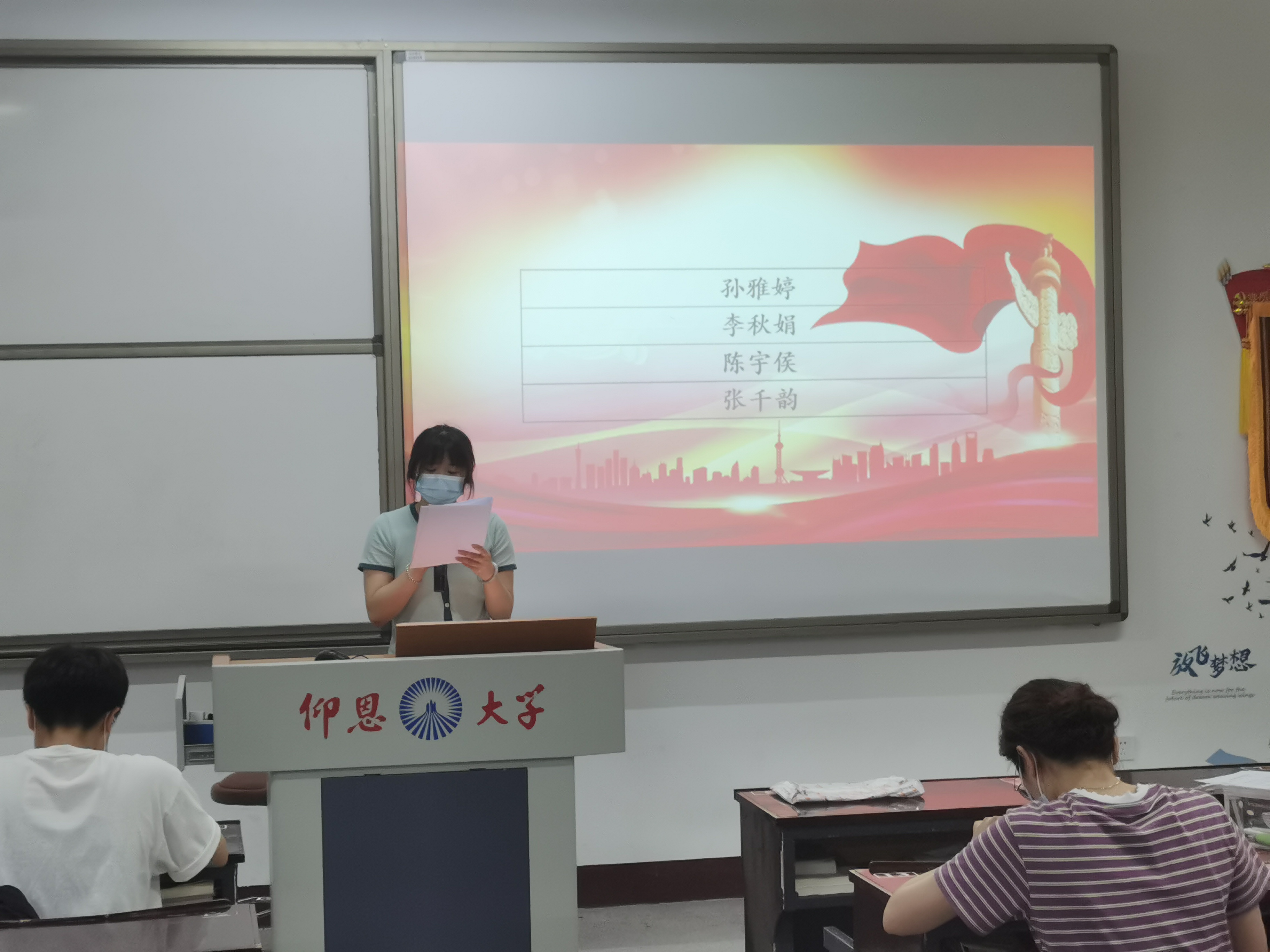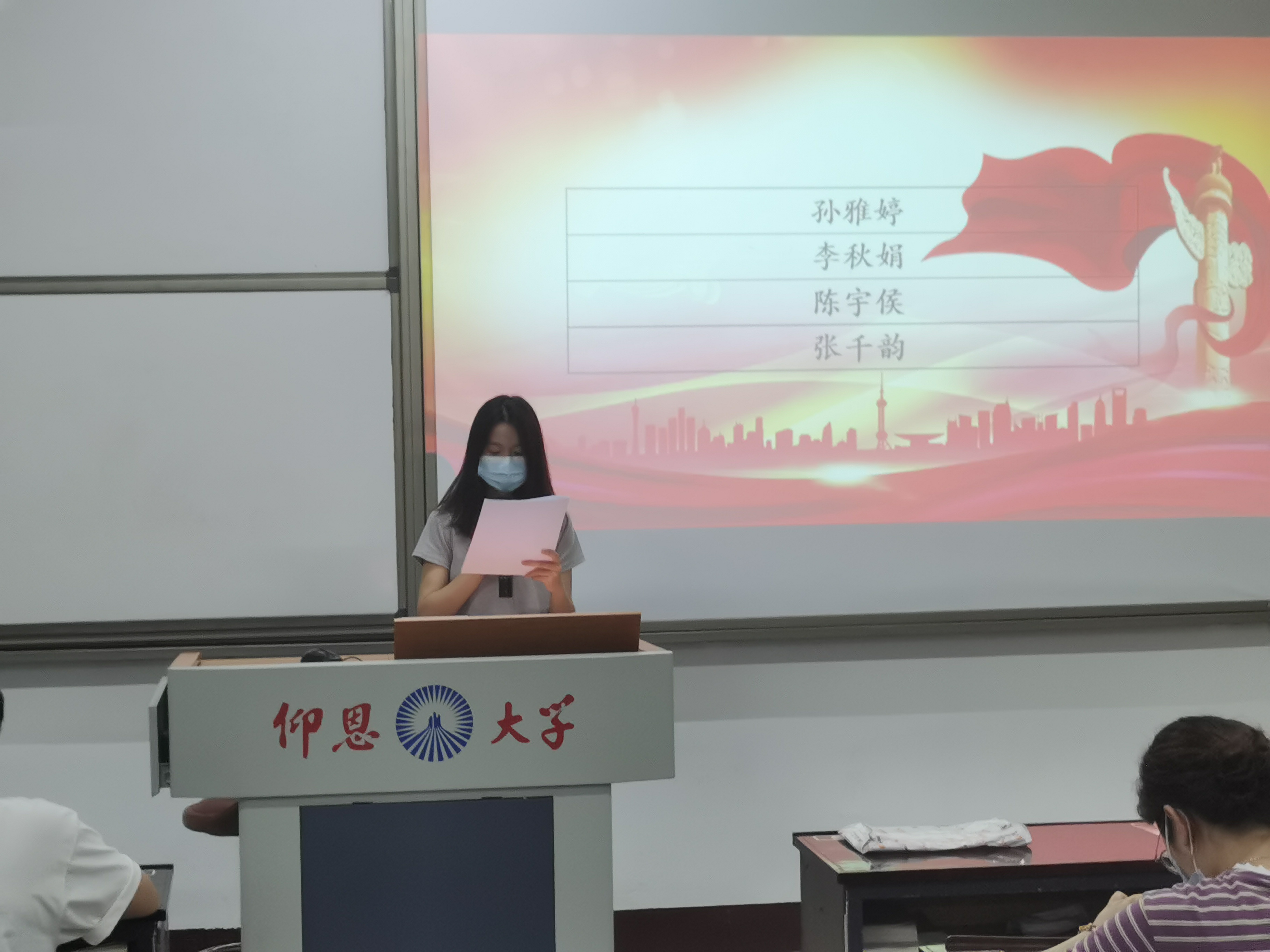 发展对象上台表态    大会认为,孙雅婷、李秋娟、陈宇侯、张千韵4名同志基本符合党员条件,经与会正式党员投票表决,大会一致同意接收孙雅婷、李秋娟等4名同志成为中共预备党员。