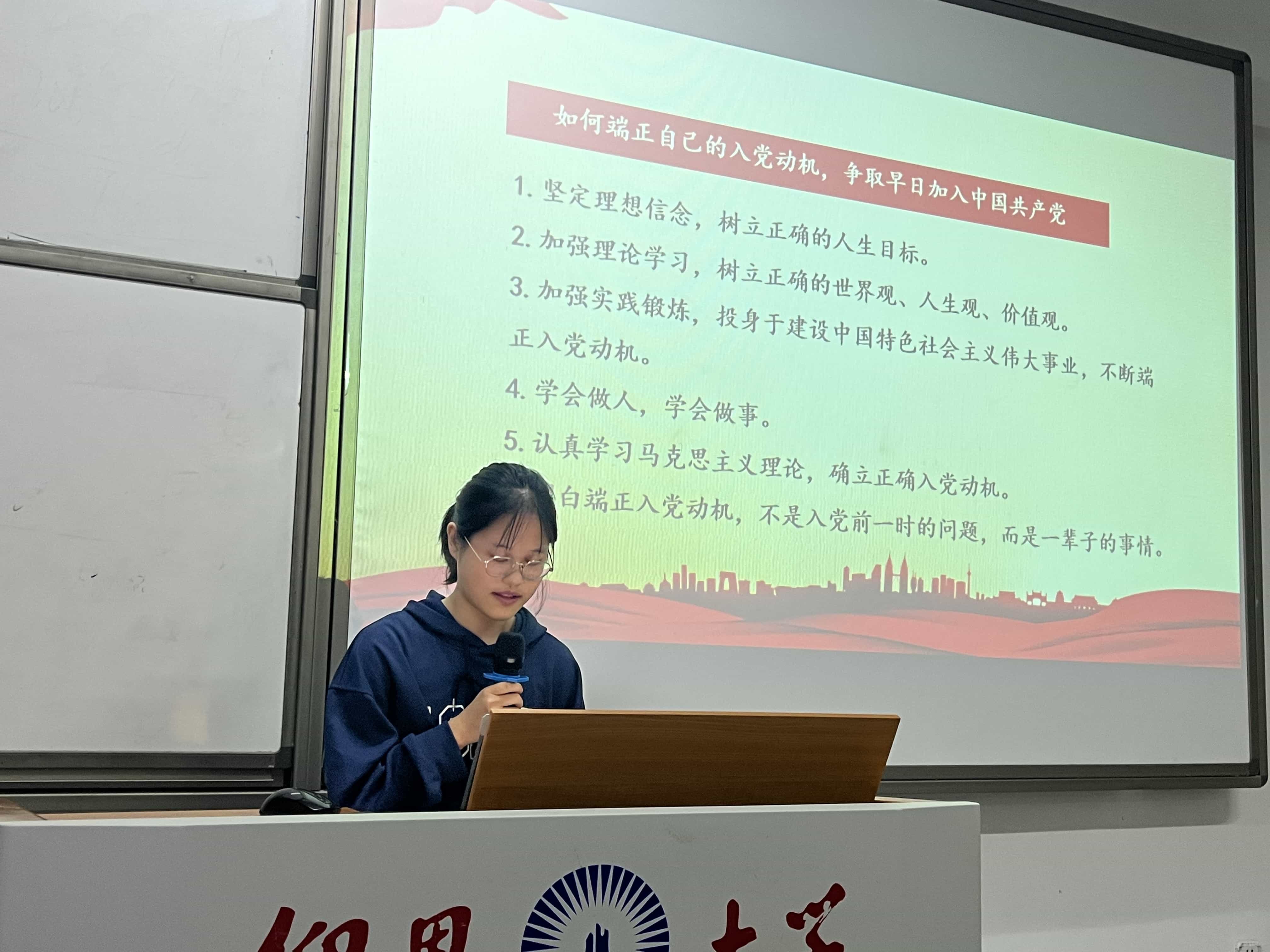 入党积极分子汇报在校情况    紧接着,17名入党积极分子分别围绕入党动机、党性、先锋模范作用等关键词,轮流进行了对党课的心得分享,用丰富翔实的历史事例展开讲述自己对党的认识和感悟,自己如何树立正确的入党动机,坚定理想信念,严守纪律规矩,增强宗旨意识,勇于担当作为,在群众中发挥发挥带头、骨干、桥梁的先锋模范作用,做一名合格的共产党员。