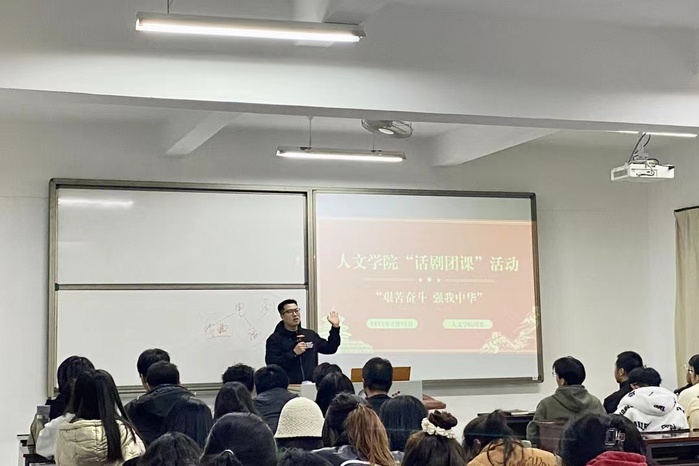 主讲人邵老师通过诙谐幽默的例子来阐释话剧的艺术性,并鼓励同学们积极的参与到话剧团课活动中去。“话剧形式的艺术手段可以帮助人们更加的体验生活、感受生活。它用台词和表演清晰的展现在你面前。通过这堂课,你可以对这种新的艺术形式有一个全新的感悟,你可能会有一种全新的生活体验方式。”讲授中,邵老师提及的博主房琪,运用了话剧的手法,展现了浔埔女的独特魅力,为同学们领悟话剧的精妙提供了典范的模板。