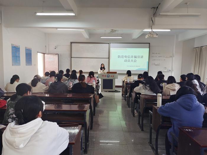 3月7日晚上,20名防诈骗宣传志愿者组成4支队伍,深入新生班级进行防诈骗宣讲。宣讲共分为四个部分:盘点常见的电信诈骗套路、电信诈骗经典案例解析、防范措施交流互动、国家反诈中心APP普及。