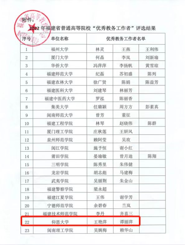 近日,福建省高等教育教学管理专业委员会根据《福建省高等教育学会教学管理专业委员会优秀教务工作者评选表彰办法》,采用电子邮件函评方式评选出2022年“优秀教务工作者”80名。此次评选结果公布,betway西汉姆联官网教务秘书谭丽萍名列其中。