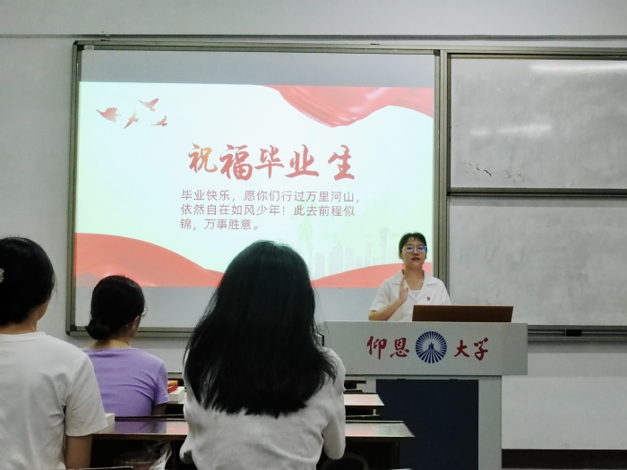 为深入开展学习贯彻习近平新时代中国特色社会主义思想主题教育,引导毕业生党员在文明离校工作中发挥先锋模范作用,进一步加强毕业生党员党性意识和廉洁自律意识,以良好的精神风貌踏入新征程。2023年6月30日中文专升本学生党支部在普照楼309组织开展“逐梦新征程,启航向未来”毕业生党员感恩教育活动,活动由支部宣传委员林雪婷主持,支部全体毕业生党员参加。活动内容包括“一堂党课,不忘初心”、“心怀初心,感恩前行”、“谆谆寄语,昂首未来”、“重温入党誓词,牢记使命”等环节。