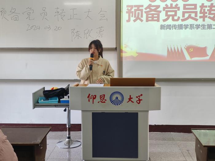 为了进一步加强betway西汉姆联官网党员队伍建设,为党组织注入新鲜血液,新闻传播学系学生第二党支部于2024年3月20日在普照楼202召开预备党员转正大会。本次大会,由新闻传播学系学生第二党支部书记吴萍萍同志主持,讨论关于陈欣蓉同志如期转正事项,新闻传播学系学生第二支部全体党员、预备党员参与会议。