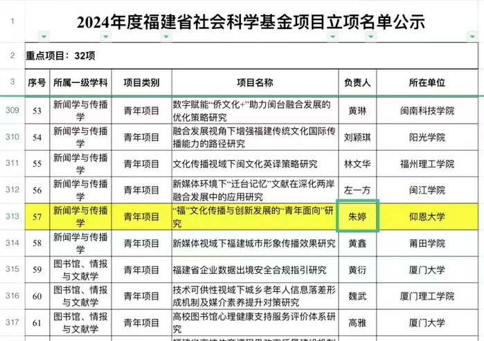 近日,2024年福建省社会科学基金项目立项名单公示,betway官网教师朱婷所申报的《“福”文化传播与创新发展的“青年面向”研究》获得立项。