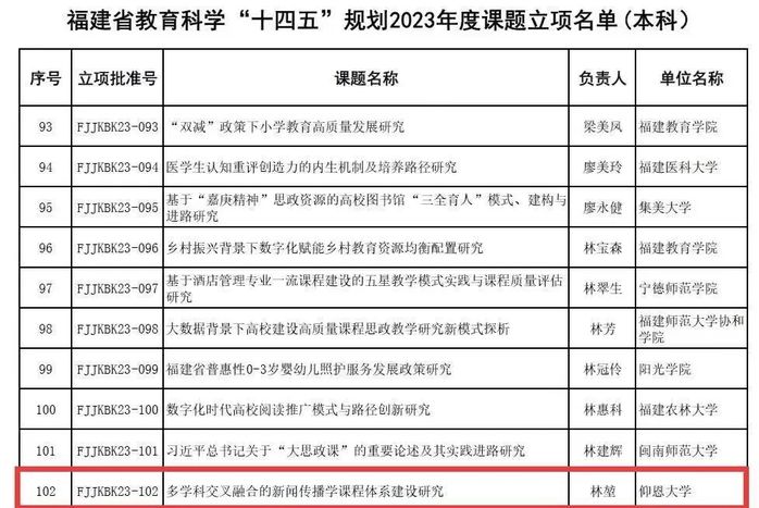 福建省教育科学规划领导小组公布了福建省教育科学“十四五”规划2023年度课题立项名单,经省教育科学规划办审核、评审,betway官网林堃老师获批福建省教育科学“十四五”规划2023年度课题立项,课题名称:《多学科交叉融合的新闻传播学课程体系建设研究》。