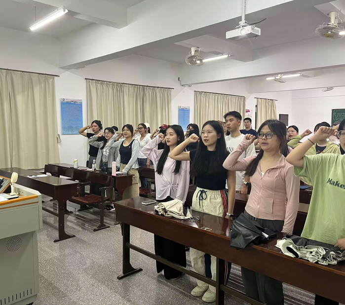 在毕业生党员发言这一环节,毕业生党员代表林瑜、吴慧媛、林美玲、江文情进行发言。重点回顾了他们入党时的初心,并向党组织交代了自己这两年来在学习、工作、思想等方面的成长情况。同时,林瑜与林美玲同志也分享了他们教招上岸的经验。林瑜同志认为,在毕业生备考的过程中,必然会出现焦虑情绪,我们应该学会与焦虑和解,勇往直前,化焦虑为动力。林美玲同志则着重分享了她的学习方法和备考经验,她鼓励23级党员要努力打破信息差,从多个渠道获取学习信息。此外,江文情与林雪婷同志也向23级党员同志介绍了三支一扶的具体政策和招录方法,并毫无保留地分享了自己的准备经验,号召支部所有党员积极探索人生道路。随后,支部书记施晓渝寄语支部毕业生党员。她指出,毕业在即,希望全体党员牢记“一个党员就是一面旗帜”,在今后的学习和工作岗位上,不断锤炼党性修养,永葆初心使命。在活动的最后,全体党员与支部书记一起重温了入党誓词,通过这一举动,毕业生党员们再次回忆起入党宣誓时的庄严承诺,进一步强化了自己的党员意识,坚定了理想信念,确保自己始终保持对党忠诚、对人民热爱。