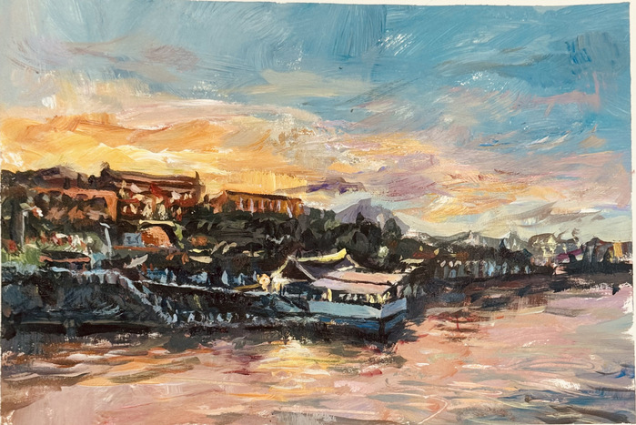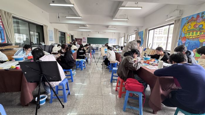 苏一森老师主要从色彩基础和校园风光创作两个部分展开《美术基础》这门课程的教学。在色彩基础方面,课程重点在于学习色彩的基础知识,确保学生能够掌握正确的调色和过渡方法。苏老师让同学们以蓝天、远山、草地等主题进行练习,学习近大远小、近实远虚等空间表现技巧。此外,苏老师鼓励同学们走出课堂,搜集、拍摄校园题材图片,将其转化为创作的灵感源泉,用画笔记录校园的珍贵瞬间,以此来全面提升同学们的色彩感知力和表达力。