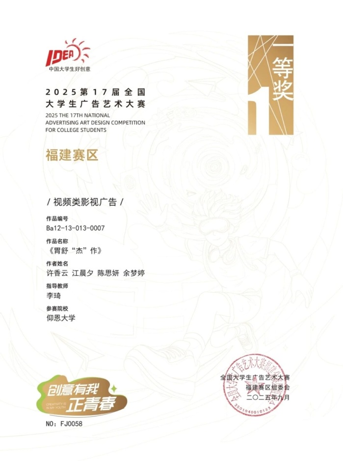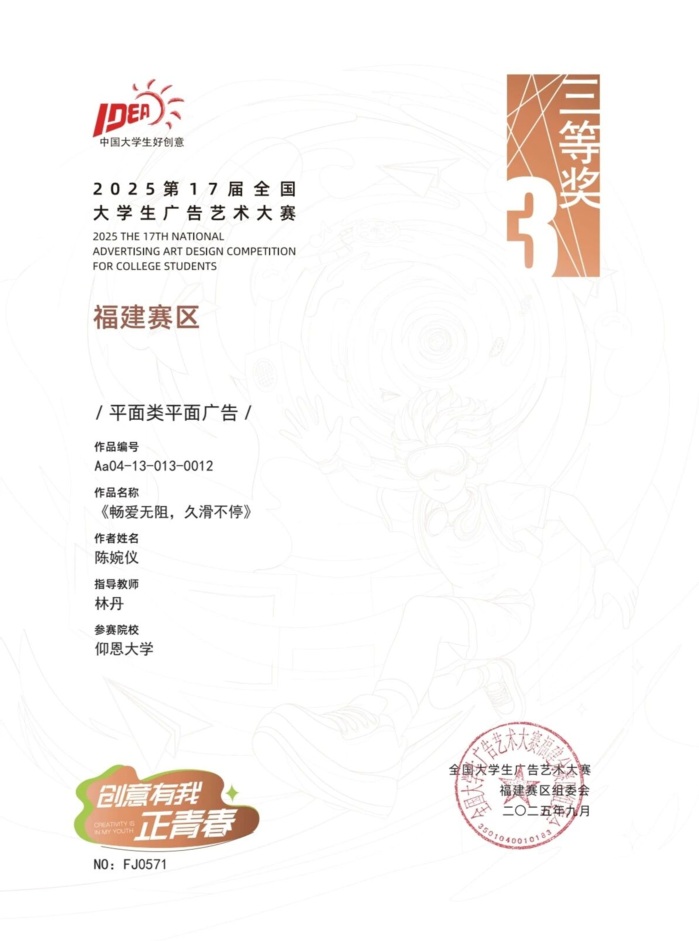 日前,第十七届全国大学生广告艺术大赛全国获奖名单公布,betway官网学子在本届比赛中取得优异成绩,共有63件作品获奖,其中获国家级奖2项,省级奖61项。在福建省赛区,betway官网作品获得一等奖4项、二等奖1项、三等奖11项、优秀奖45项;在全国比赛中,获三等奖2项。
