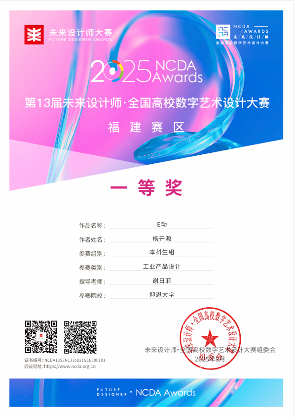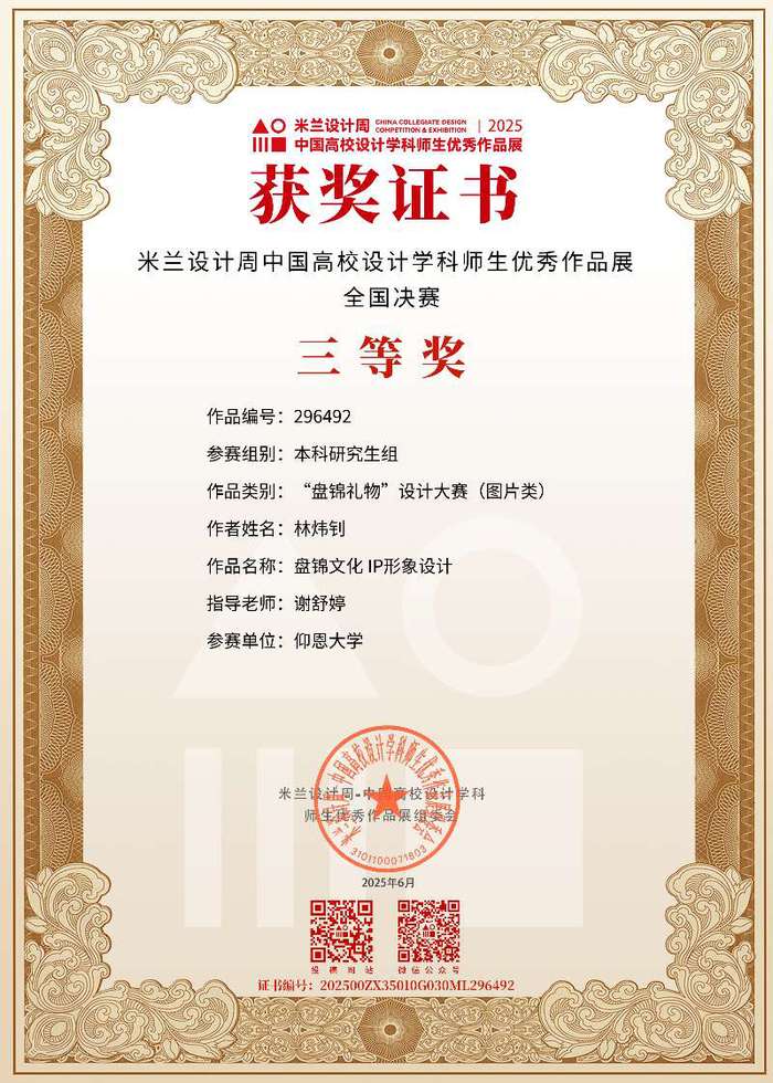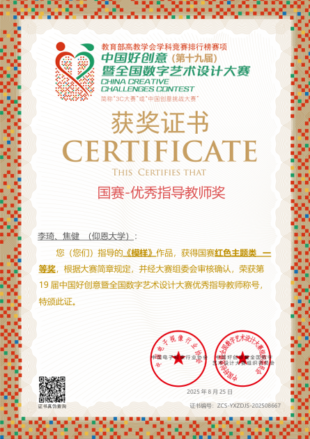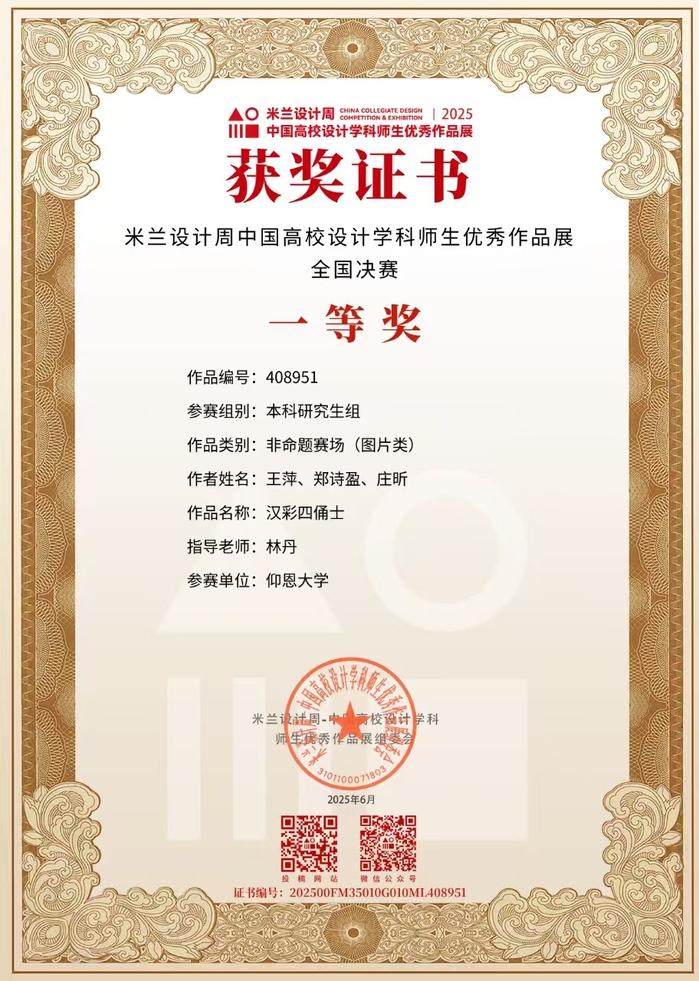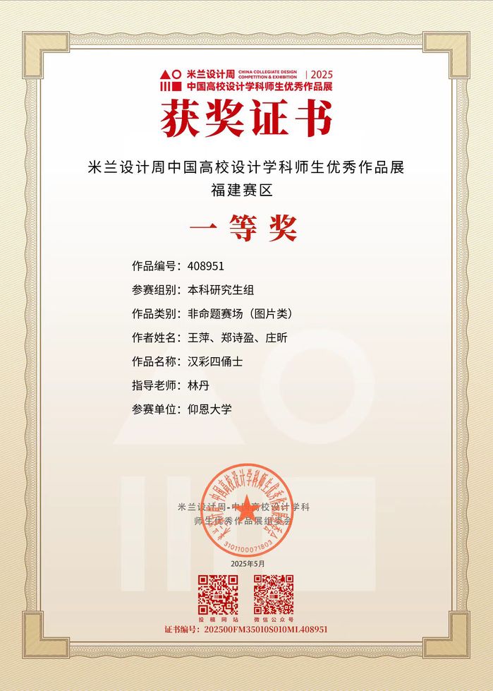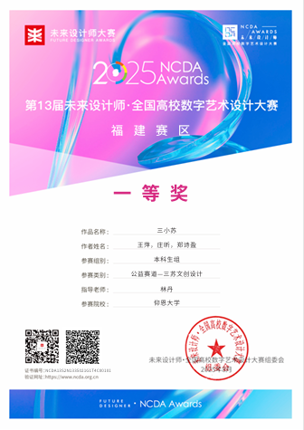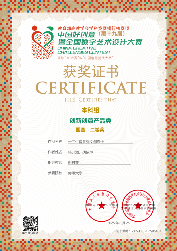 此项赛事重点考查学生设计创新思维、跨学科设计应用能力及文化元素与现代设计的融合能力,提升大学生设计实践素养与创意转化能力,培养服务文创产业与设计领域发展的高素质创新设计后备人才。betway官网学子获国家奖共2项,其中一等奖1项,三等奖2项;获省级奖共3项,其中一等奖1项,二等奖1项,三等奖1项。